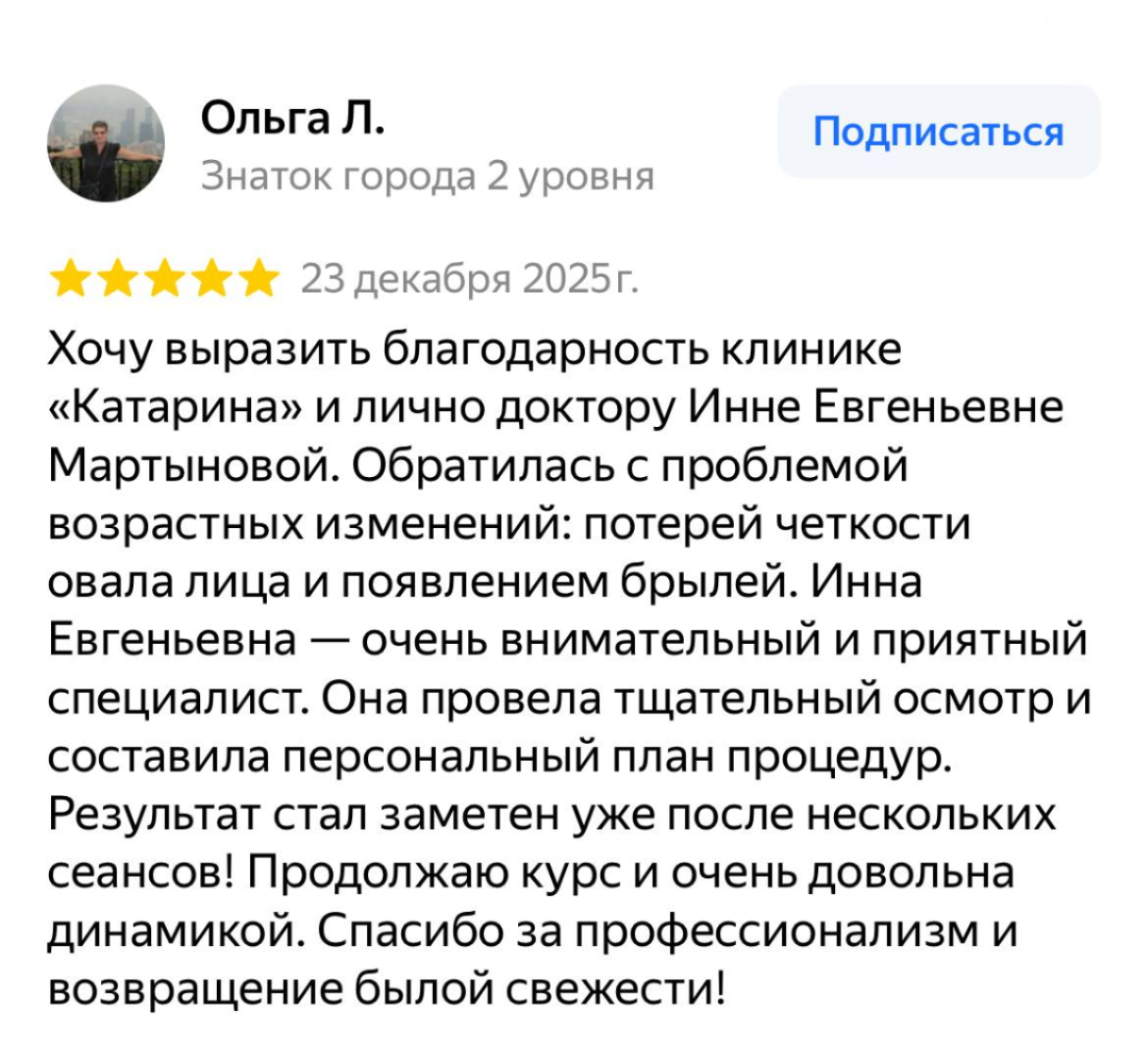 Хочу выразить благодарность клинике «Катарина» и лично доктору Инне Евгеньевне Мартыновой. Обратилась с проблемой возрастных изменений: потерей четкости овала лица и появлением брылей. Инна Евгеньевна — очень внимательный и приятный специалист. Она провела тщательный осмотр и составила персональный план процедур. Результат стал заметен уже после нескольких сеансов! Продолжаю курс и очень довольна динамикой. Спасибо за профессионализм и возвращение былой свежести!